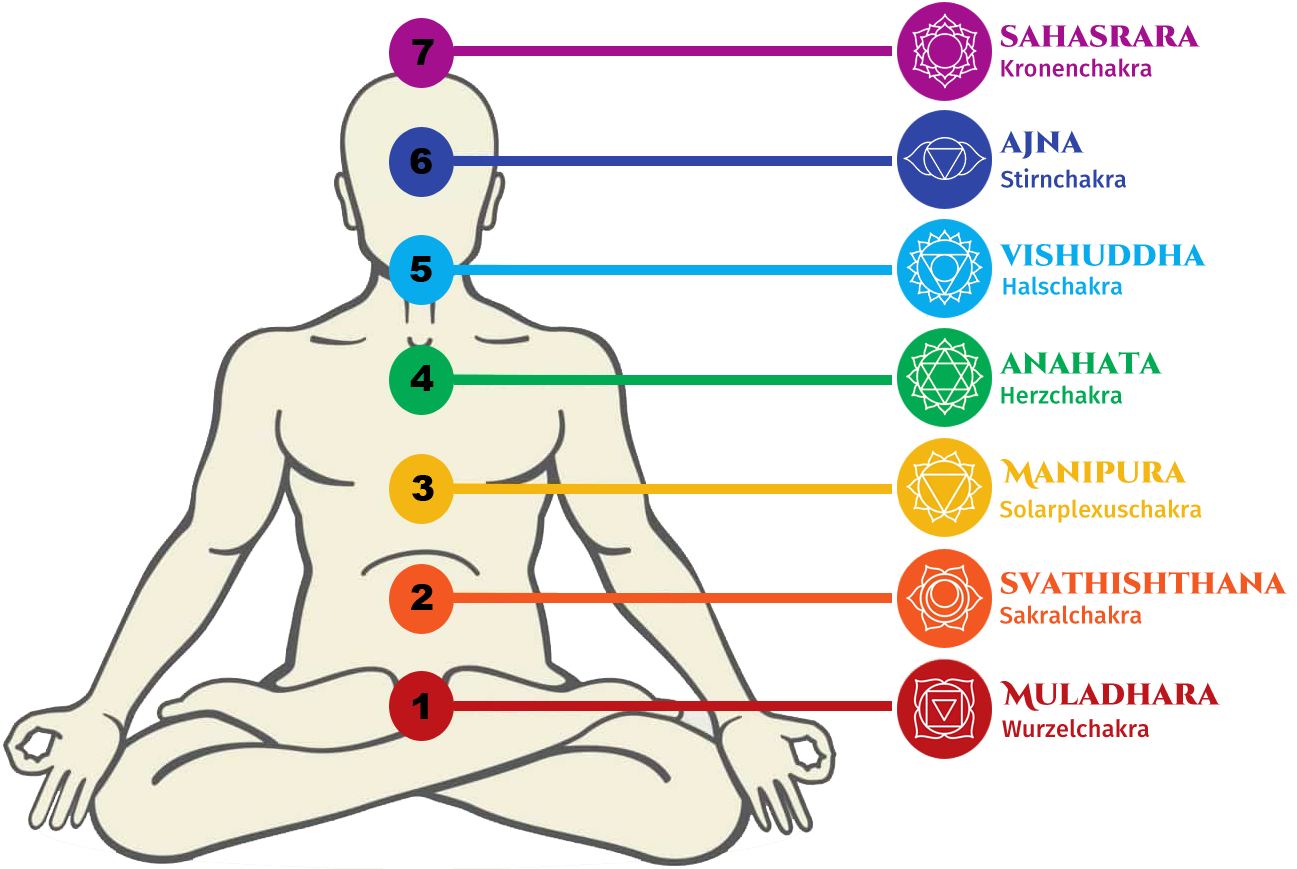 Die Abbildung zeigt die Anordnung der 7-Chakren (beachte die Nummerierung 1-7) sowie deren Symbole und Farben. Die Bezeichnungen der 7-Chakren (von unten bis oben) sind: